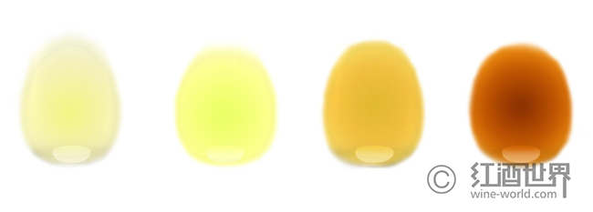 對于白葡萄酒來說,酒液中的單寧含量極少,因而在陳年時幾乎是一個純粹氧化的過程,顏色在這一過程中會逐漸變得深濃,由檸檬色或淺綠色轉(zhuǎn)(zhuǎn)為金黃色,繼而轉(zhuǎn)(zhuǎn)變?yōu)殮晟?/span>