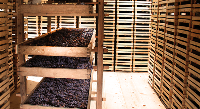 常見的風(fēng)干工藝之一是將果實留在葡萄藤上進行自然風(fēng)干,待葡萄在藤上變干、糖分得到高度濃縮之后再采收,用于釀造甜酒。此種工藝對天氣條件有特定的要求,葡萄必須在溫暖干燥的秋季才能風(fēng)干,否則會容易感染灰霉菌。在法國蘇玳(Sauternes)產(chǎn)區(qū),倘若葡萄沒有成功感染貴腐菌,一些酒莊便會采用此方法幫助葡萄濃縮糖分,釀造出風(fēng)味濃郁、口感美妙的甜酒。用這種方式釀造出的葡萄酒有時會在酒標(biāo)上標(biāo)注“晚采收(Late Harvest)”。另外,也可將采摘后的葡萄鋪在草席上于室外曬干,又或者把葡萄放置于干燥通風(fēng)的屋子中風(fēng)干〔此風(fēng)干工藝在意大利瓦坡里切拉(Valpolicella)產(chǎn)區(qū)廣泛使用,在當(dāng)?shù)乇环Q作“枯藤法”(Appassimento)〕。風(fēng)干后的葡萄流失了大量水分,果實中的糖分和風(fēng)味物質(zhì)得以濃縮,因此釀成的葡萄酒擁有飽滿的酒體和較高的酒精度,風(fēng)味也十分濃郁。