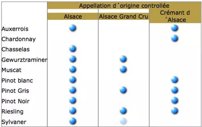 阿爾薩斯三種原產(chǎn)地命名制度和葡萄品種對應(yīng)圖