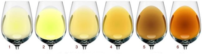 顏色并不能100%反映葡萄酒的甜度。但如果釀造的時(shí)候,大部分白葡萄酒的糖分以榨取葡萄皮而來(lái),那葡萄酒的顏色便會(huì)更易顯見(jiàn)。例如法國(guó)波爾多蘇玳(Sauternes) 的甜葡萄酒主要以賽美容(Semillion)釀造,釀造過(guò)程會(huì)作短暫泡皮工序,所以一般顏色會(huì)偏向啡黃色,偏向附圖的(4)。相反例如麝香(Muscat) 或瓊瑤漿(Gewurztraminer)葡萄則不一定有明顯深啡色,較偏向?yàn)楦綀D(3)。
