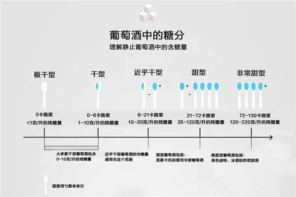 國(guó)際上還有一種通用的量化方法,那就是用勺數(shù)來表示,詳見下圖。一個(gè)標(biāo)準(zhǔn)勺為 1 盎司(約等于 28.35 克),如下圖所示,干型的殘?zhí)橇糠秶恍蝸蟮謀硎緸?0 勺到 1/3 勺之間,近乎干殘?zhí)橇康姆秶槐硎緸?1/3 勺至1勺+之間。