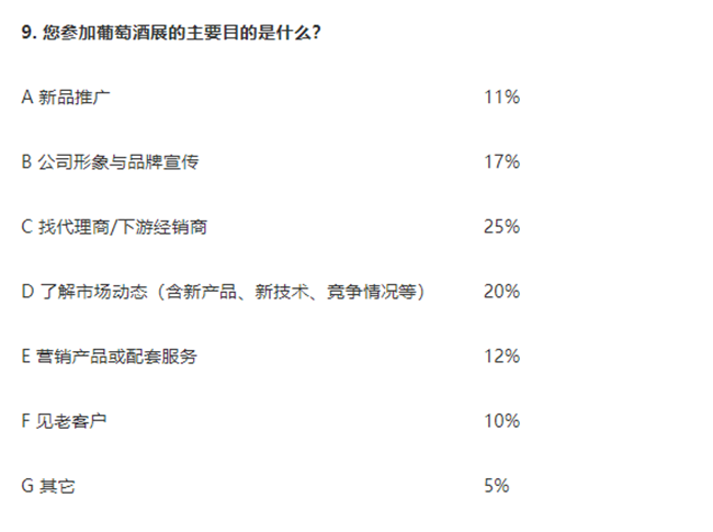 9. 25%企業均參加葡萄酒展的主要目為尋找代理商/下游經銷商