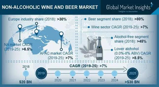 根據(jù)全球市場洞察(Global Market Insights)2019年發(fā)布的報告,2018年無醇葡萄酒和無醇啤酒市場規(guī)模為200億美元,預(yù)計從2019年到2025年,年復(fù)合增長率將超過7%,達(dá)300億美元,以下是部分?jǐn)?shù)據(jù):