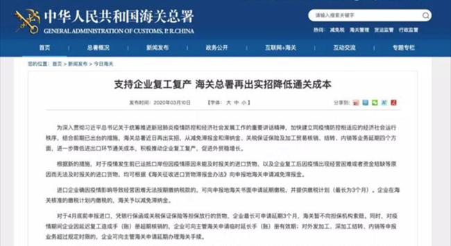 海關(guān)(guān)總署3月10日在其官網(wǎng)(wǎng)發(fā)(fā)布《支持企業(yè)(yè)復(fù)(fù)工復(fù)(fù)產(chǎn)(chǎn) 海關(guān)(guān)總署再出實(shí)招降低通關(guān)(guān)成本》的文章。