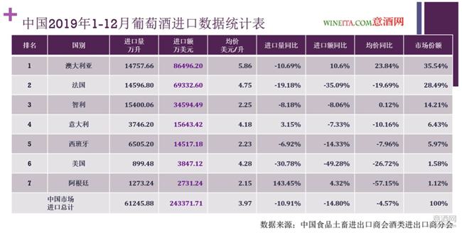 近日,中國食品土畜進出口商會酒類進出口商分會發布了來自中國海關的2019年度中國進口葡萄酒統計數據。2019年中國進口葡萄酒總量為61245.88萬升,進口總額為24.3371億美元,分別相比2018年下降了10.91%和14.8%。進口葡萄酒均價為3.97美元/升,同比2018年度下降了4.57%。