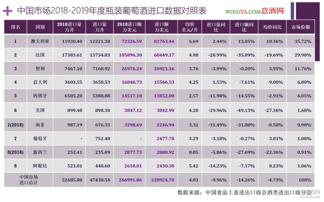 為了更好的對照數據,我們將2018年度瓶裝葡萄酒進口額排名前八的供應國數據也放進2019年瓶裝葡萄酒進口數據中。從對照表可以看出,2019年度中國進口瓶裝葡萄酒總量為47438.54萬升,瓶裝葡萄酒進口總額為22.8924億美元,相比2018年分別下降9.96%和14.26%。瓶裝葡萄酒進口均價為4.83美元/升,相比2018年下降了4.73%。