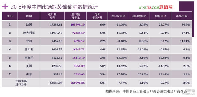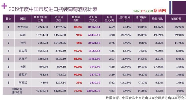 排名第二的法國瓶裝葡萄酒進口總量為13734.83萬升,進口總額為6.8449億美元,相比2018年分別下降20.99%和35.09%。進口均價為4.98元/升,相比2018年下降了19.69%,占據了29.90%的市場份額。對比2018年占據39.7%的市場份額,跌幅超過25%。