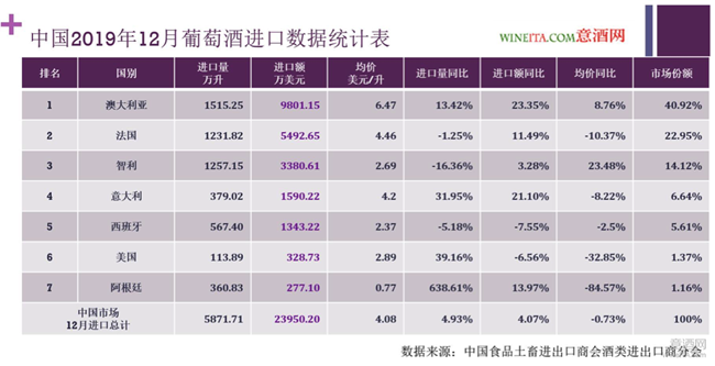 讓意酒網對阿根廷引起關注的原因,是下圖這張2019年12月葡萄酒進口數據統計表,排在第七位的阿根廷,進口量同比暴增638.61%,進口額卻只增長了13.97%,進口均價只有0.77美元/升,下滑幅度達到84.57%。當然,排在第四位的意大利,在2019年12月也出現了進口量同比增長31.95%,和進口額同比增長21.1%的優異增長。