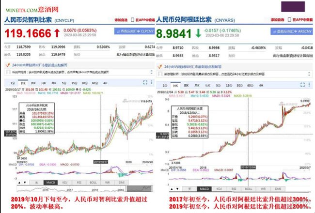 意酒網搜索了人民幣對主要葡萄酒生產國的匯率。發現2019年以來,人民幣對美元和歐元匯率一直在正負4%的幅度內波動。但是從2017年初至今,人民幣對阿根廷比索的匯率升值達到300%,從2019年初至今,人民幣對阿根廷比索的匯率升值達到200%。原來時因為匯率的大幅度波動,導致阿根廷葡萄酒的進口價格大幅度下跌。這種匯率變動,短期看對阿根廷葡萄酒價格有利,但是從長期看,阿根廷葡萄酒蘊含較大風險。