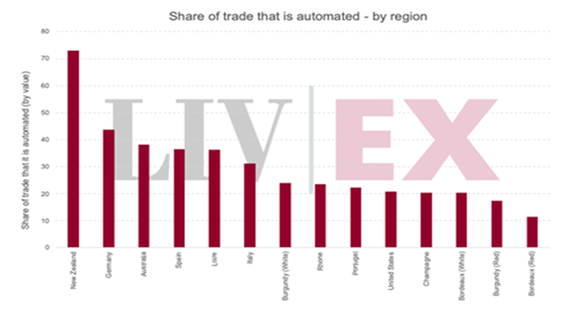 我們發(fā)現(xiàn),在Liv-ex上非傳統(tǒng)強勢市場的酒區(qū),它們會有更多葡萄酒通過自動化來進(jìn)行交易。 如新西蘭:該酒區(qū)有超過70%的葡萄酒交易都涉及自動化。