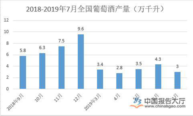 葡萄酒行業(yè)(yè)分析表示,根據(jù)(jù)國(guó)家統(tǒng)(tǒng)計(jì)局最新數(shù)(shù)據(jù)(jù)顯示,2018年全年全國(guó)葡萄酒產(chǎn)(chǎn)量達(dá)(dá)到了62.9萬千升,累計(jì)下降7.4%。截止至2019年6月全國(guó)葡萄酒產(chǎn)(chǎn)量為4.3萬千升,同比下降6.5%。累計(jì)方面,2019年1-6月全國(guó)葡萄酒產(chǎn)(chǎn)量達(dá)(dá)到24.5萬千升,累計(jì)下降19.9%。