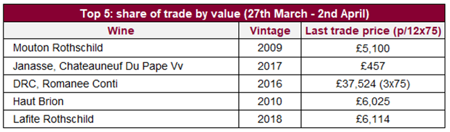 本月五大最高交易總值葡萄酒,分別來自三大一級酒莊、南羅納和勃艮第;而前十位也全是法國葡萄酒。 盡管波爾多(45.9%)份額保持不變,但勃艮第份額(12.5%)也有增長;這主要是受其白葡萄酒的交易增長所推動。