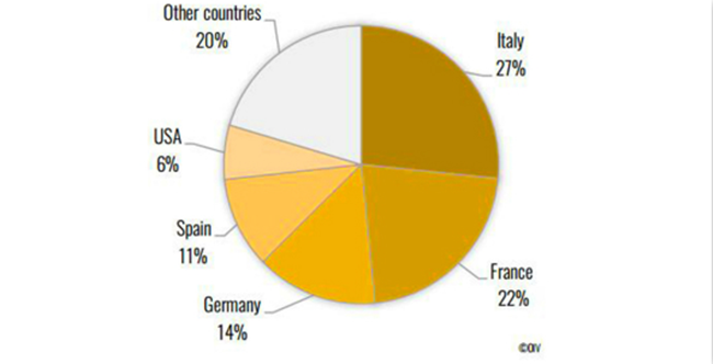 全球主要起泡酒出口市場:意大利(3.9億升)、法國(1.9億升)、西班牙(1.8億升)、其它國家(1.3億升)。