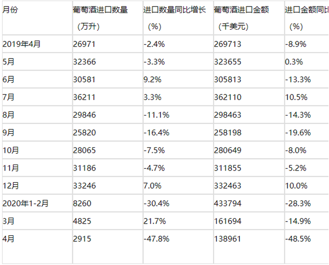 近日,中國(guó)海關(guān)(guān)發(fā)(fā)布相關(guān)(guān)數(shù)(shù)據(jù)(jù)顯示:2020年1-4月中國(guó)葡萄酒進(jìn)口數(shù)(shù)量為15990萬(wàn)升,相比上年同期減少了90513.6萬(wàn)升,降幅為25.3%;進(jìn)口金額為733117千美元,相比上年同期減少了331919千美元,降幅為31.1%;2020年1-4月中國(guó)葡萄酒進(jìn)口均價(jià)為45.85千美元/萬(wàn)升。