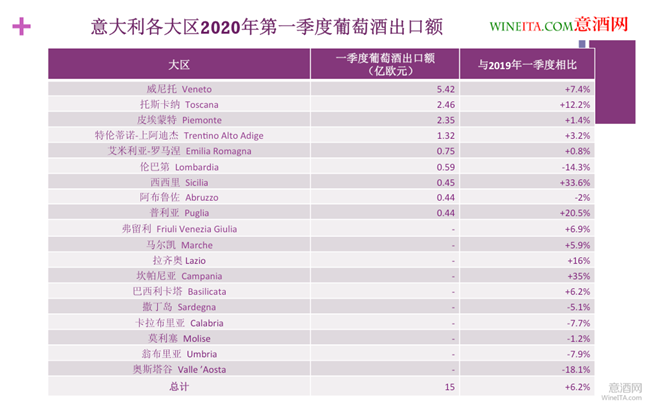 細(xì)分到各大區(qū)(qū),2020年第一季度葡萄酒出口額排名前三位的依次是威尼托大區(qū)(qū)(Veneto)、托斯卡納大區(qū)(qū)(Toscana)和皮埃蒙特大區(qū)(qū)(Piemonte)。