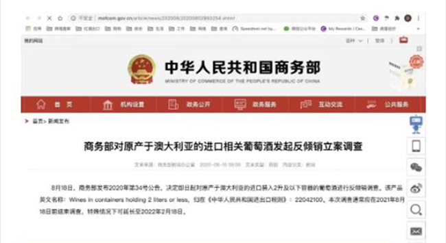 首先是中國(guó)對(duì)澳大利亞葡萄酒展開(kāi)為期幾個(gè)月的反傾銷調(diào)查,一旦傾銷被認(rèn)證,中國(guó)可能對(duì)澳大利亞葡萄酒加征懲罰性關(guān)稅,關(guān)稅可能為商品價(jià)格的202.7%。