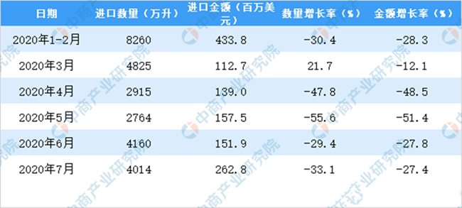 2020年1-7月中國葡萄酒進口量及金額增長情況
