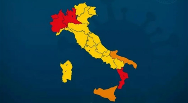綜合意大利《24小時太陽報》、安莎社、Fanpage網站等報道,意衛生部將全國分為紅色、橙色和黃色3種不同風險地區。其中,最高風險的“紅區”包括:倫巴第(Lombardia)、皮埃蒙特(Piemonte)、卡拉布里亞(Calabria)、瓦萊達奧斯塔(Valle d'Aosta);中等風險的“橙區”包括:普利亞(Puglia)、西西里(Sicilia);其余地區均被歸為風險較低的“黃區”。根據目前疫情趨勢,威尼托(Veneto)、利古里亞(Liguria)、坎帕尼亞(Campania)和托斯卡納(Toscana)的指標已非常接近“橙區”。
