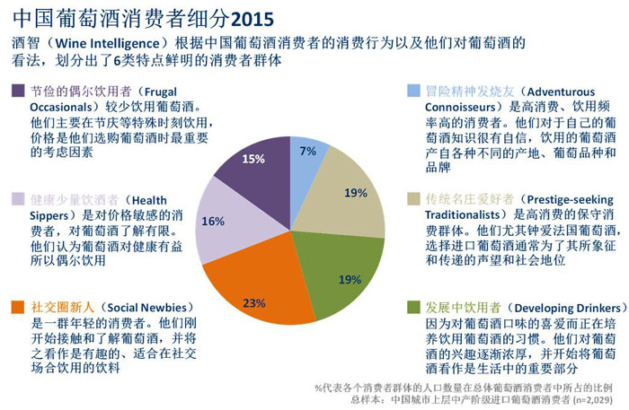 針對中國的3800萬進(jìn)口葡萄酒消費者,酒智(Wine Intelligence)劃分出了6類特點鮮明的消費者類別。除了上述提及的 “發(fā)展中飲用者”(Developing Drinkers),其他5類包括“冒險精神發(fā)燒友”(Adventurous Connoisseurs)、“傳統(tǒng)名莊愛好者”(Prestige-seeking Traditionalists)、“社交圈新人”(Social Newbies)、“健康少量飲酒者”(Health Sippers)和“節(jié)儉的偶爾飲用者”(Frugal Occasionals)。酒智(Wine Intelligence)的消費者劃分不僅基于年齡、性別和收入等基本信息,還涉及消費者的購買飲用行為以及他們對于葡萄酒的看法,包括:他們?yōu)楹物嬘悶咸丫疲綰巫齔鮭徺I決定,以及飲用何種葡萄品種和產(chǎn)地等等。