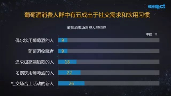 消費者人群的構(gòu)成當(dāng)中,剛開始在社交場合上活動的新人,和正逐漸形成葡萄酒飲用習(xí)慣的人群幾乎占據(jù)了整個人群的半壁江山。