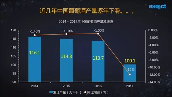 從統(tǒng)計數(shù)據(jù)看,2014-2017年,中國葡萄酒產(chǎn)量呈逐年下滑態(tài)勢。2017年中國葡萄酒產(chǎn)量為100.1萬千升,同比下滑12%。據(jù)業(yè)內(nèi)人士認(rèn)為,中國葡萄酒正處于調(diào)整優(yōu)化期,劣質(zhì)產(chǎn)能下滑,優(yōu)質(zhì)產(chǎn)能上升。一方面,進口品牌對中國葡萄酒產(chǎn)業(yè)造成巨大沖擊;另一方面,低端低價競爭把國產(chǎn)葡萄酒逼入死胡同。