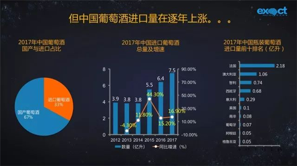 據(jù)統(tǒng)計數(shù)據(jù)顯示,2017年,中國消費的葡萄酒中約1/3來自于進口,進口總量為7.5億升,同比增長16.9%。其中七成多為瓶裝葡萄酒。從進口來源國來看,中國進口葡萄酒主要來自于法國、澳大利亞、智利、西班牙。