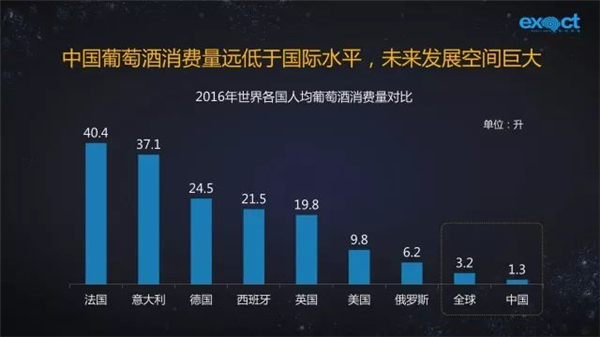 2016年,中國人均葡萄酒消費量僅為1.3升,與法國、意大利、德國有很大差距,也低于全球平均水平。中國葡萄酒消費還有很大的發(fā)展空間。
