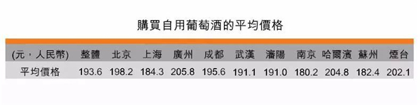 對(duì)于購(gòu)買自用的葡萄酒,受訪者趨向理性消費(fèi)。47%受訪者購(gòu)買葡萄酒的價(jià)格范圍在101-200元之間;整體受訪者平均購(gòu)買自用的葡萄酒價(jià)格約193.6元一瓶。其中,廣州為205.8元、哈爾濱為204.8元,煙臺(tái)為202.1元,受訪者平均購(gòu)買自用葡萄酒的價(jià)格較高,超過(guò)200元一瓶。