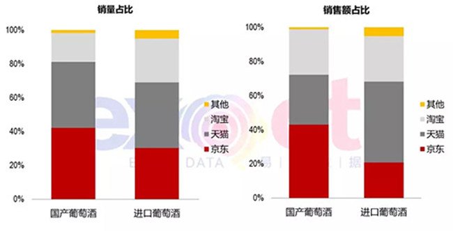 從平臺分布來看,無論國產(chǎn)還是進(jìn)口葡萄酒均在天貓、京東、淘寶銷售情況最佳,銷售占比超過90%。對比來看,國產(chǎn)葡萄酒在京東的銷售優(yōu)于其他平臺,而進(jìn)口葡萄酒則以天貓為主要銷售陣地。