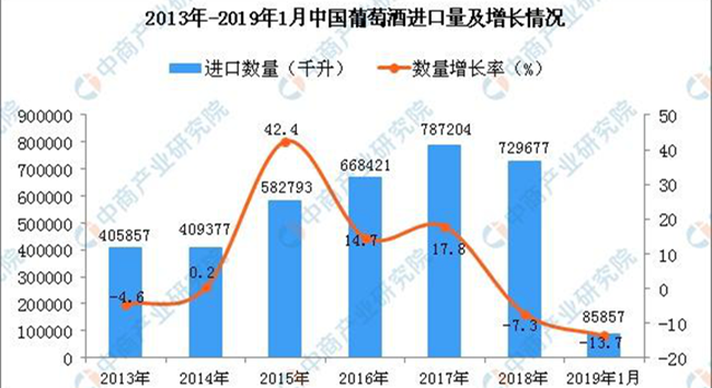 據(jù)(jù)中商產(chǎn)(chǎn)業(yè)(yè)研究院數(shù)(shù)據(jù)(jù)庫(kù)顯示,2013年-2017年中國(guó)葡萄酒進(jìn)口量增長(zhǎng),共增長(zhǎng)381347千升,增長(zhǎng)93.96%;2018年中國(guó)葡萄酒進(jìn)口量回落,2019年1月中國(guó)葡萄酒進(jìn)口量為85857千升,同比下降13.7%。
