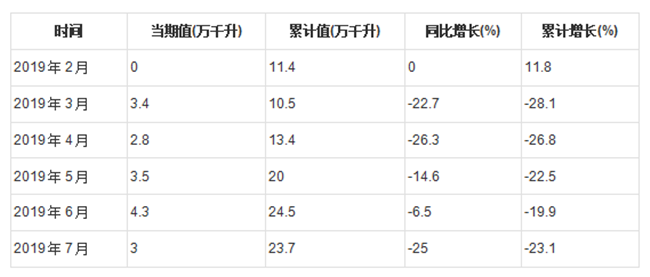 2019年7月全國(guó)葡萄酒產(chǎn)(chǎn)量為3萬(wàn)千升,累計(jì)值為23.7萬(wàn)千升,同比下降25%,累計(jì)下降23.1%。