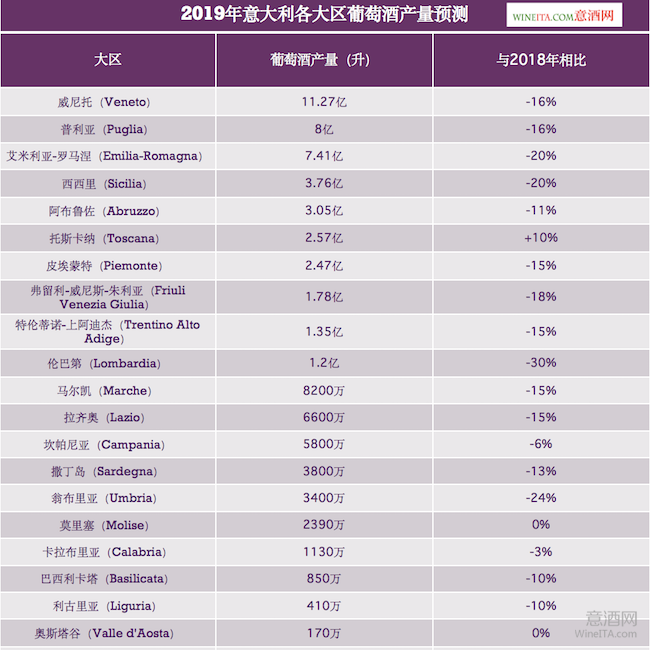 根據(jù)目前的預(yù)測,在所有大區(qū)中,2019年份葡萄酒產(chǎn)量最高的將是威尼托(Veneto)大區(qū),預(yù)計達(dá)到11.2億升,將比2018年減少16%。第二、第三位依次是普利亞(Puglia)大區(qū)和艾米利亞-羅馬涅(Emilia-Romagna)大區(qū),葡萄酒產(chǎn)量預(yù)計分別將達(dá)到8億升和7.41億升。