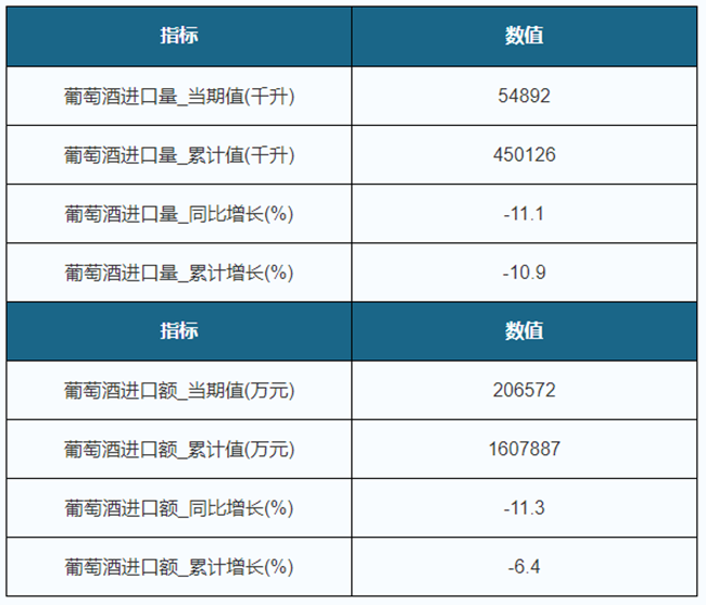2019年8月我國葡萄酒進(jìn)(jìn)口量為54892千升,同比下降11.1%,進(jìn)(jìn)口金額為206572萬元,同比下降11.3%;1-8月進(jìn)(jìn)口量為450126千升,累計(jì)下降10.9%,進(jìn)(jìn)口金額為1607887萬元,累計(jì)下降6.4%。