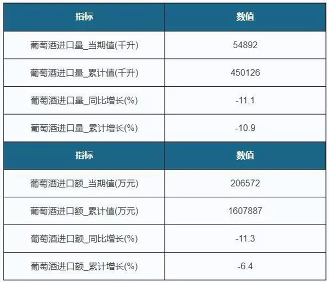 2019年8月我國(guó)葡萄酒進(jìn)口量為54892千升,同比下降11.1%,進(jìn)口金額為206572萬(wàn)元,同比下降11.3%;1-8月進(jìn)口量為450126千升,累計(jì)下降10.9%,進(jìn)口金額為1607887萬(wàn)元,累計(jì)下降6.4%。