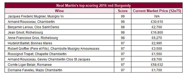 Martin總結(jié):“勃艮第的頂級與其它葡萄酒之間,它們的質(zhì)量差距遠(yuǎn)小于其市場價格差距”。 下表列出了最高得分的2016年份勃艮第葡萄酒及其目前市場價格。