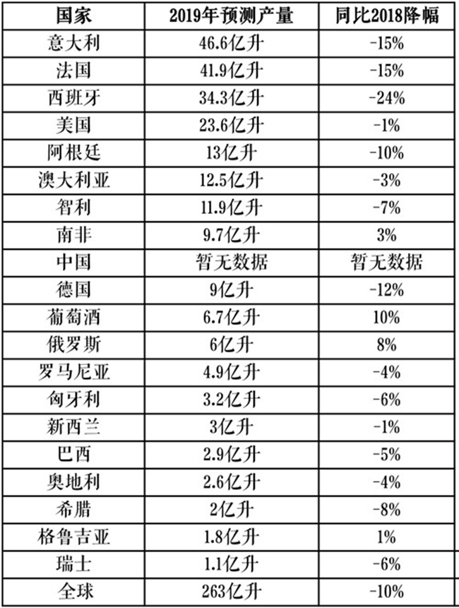 據(jù)國(guó)際葡萄與葡萄酒組織(OIV)最新數(shù)據(jù)顯示,2019年全球葡萄酒產(chǎn)量為263億升(mhl),同比2018年下降了10.54%。