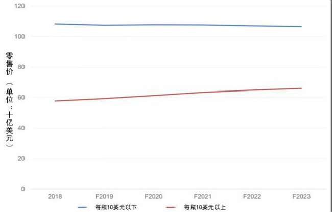 如果這些預(yù)測成真,這將意味著每瓶10美元以下葡萄酒的銷量份額將從87%降至85%,銷售額份額將從65%降至62%。