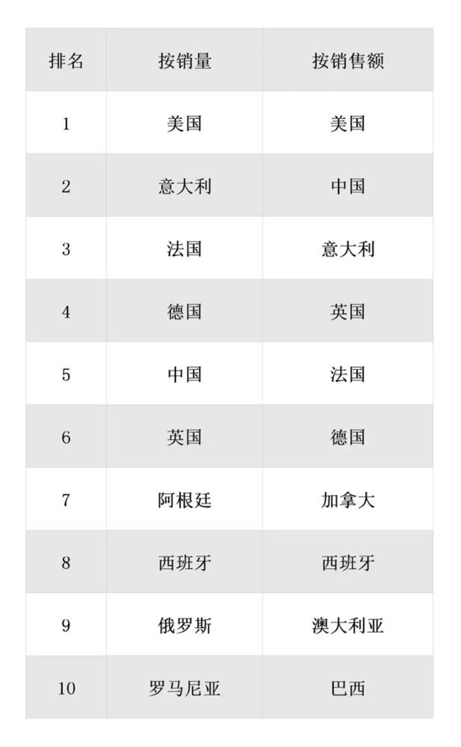 按銷售額計(jì)算,排名有更多的變動(dòng)。意大利從第5位上升到第3位,英國從第3位下降到第4位,法國從第4位下降到第5位。西班牙和澳大利亞分列第8和第9位,巴西取代日本,躍居第10位。