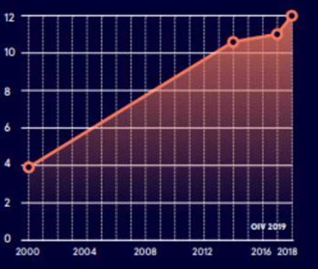 2000年至2018年的中國(guó)的紅酒葡萄種植園占世界的比重,如下圖所示,一直說(shuō)在快速的增加過(guò)程中。