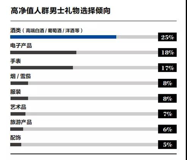 25%的高凈值男士喜歡選擇酒類作為禮物進行贈送。這種現(xiàn)象也反映在收藏領(lǐng)域。