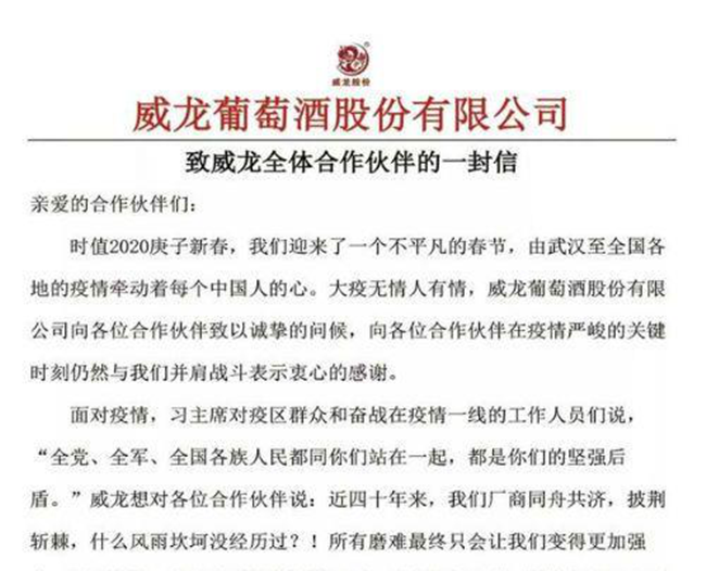 在威龍葡萄酒發(fā)布的公開(kāi)信中能看到,企業(yè)正試圖通過(guò)“攜手并肩,共渡時(shí)艱”這樣的積極話語(yǔ)來(lái)增強(qiáng)與合作伙伴之間的聯(lián)系。記者從威龍葡萄酒方面進(jìn)一步了解到,除了在公開(kāi)信中表達(dá)的正面語(yǔ)言,企業(yè)還提出了具體的“渡過(guò)時(shí)艱”舉措,例如陸續(xù)恢復(fù)物流配送以保障合作伙伴的訂單發(fā)貨需求、強(qiáng)化疫情管控等。
