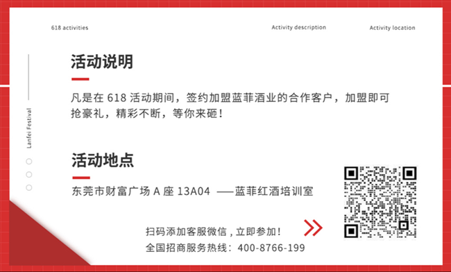 “618”購物狂歡節(jié)(jié)是與‘雙11’遙相呼應(yīng)(yīng)的一個(gè)全民網(wǎng)(wǎng)購狂歡節(jié)(jié),現(xiàn)(xiàn)已逐漸成為線上線下綜合的全民購物狂歡節(jié)(jié)。為迎接618狂歡慶典的到來,藍(lán)(lán)菲特舉辦“藍(lán)(lán)菲618,我要發(fā)(fā)”系列活動(dòng),惠饋我們新簽約合作的加盟商/代理商們,與我們共建紅酒事業(yè)(yè)。