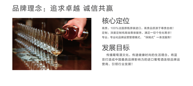 藍(lán)(lán)菲用十二年的經(jīng)(jīng)驗(yàn)(yàn),打造了獨(dú)(dú)一無二的品牌體系和運(yùn)(yùn)營(yíng)體系,在十二年的時(shí)間里一直秉持“追求卓越、誠(chéng)信共贏” 的經(jīng)(jīng)營(yíng)理念和服務(wù)(wù)宗旨,以客戶為中心、以市場(chǎng)為導(dǎo)(dǎo)向,致力于打造中國(guó)最有品牌影響力的進(jìn)(jìn)口紅酒連鎖品牌。