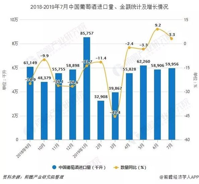 據(jù)中國海關(guān)總署數(shù)據(jù)顯示,2019年1-2季度中國葡萄酒進(jìn)口量有所增長,2019年7月中國葡萄酒進(jìn)口量為59956千升,同比增長3.3%。累計(jì)方面,2019年1-7月中國葡萄酒進(jìn)口量達(dá)到395429千升,同比下降10.8%。