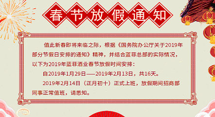 尊敬的藍菲代理商、經銷商們: 值此新春即將來臨之際,藍菲酒業全體員工提前祝大家:新春快樂,闔家幸福。 自2019年1月29日2019年2月13日,共16天,為 藍菲酒業 春節假期,于2019年2月14日(正月初十)正式上班,放假期間公司安排人員正常值班,請悉知。 新春...